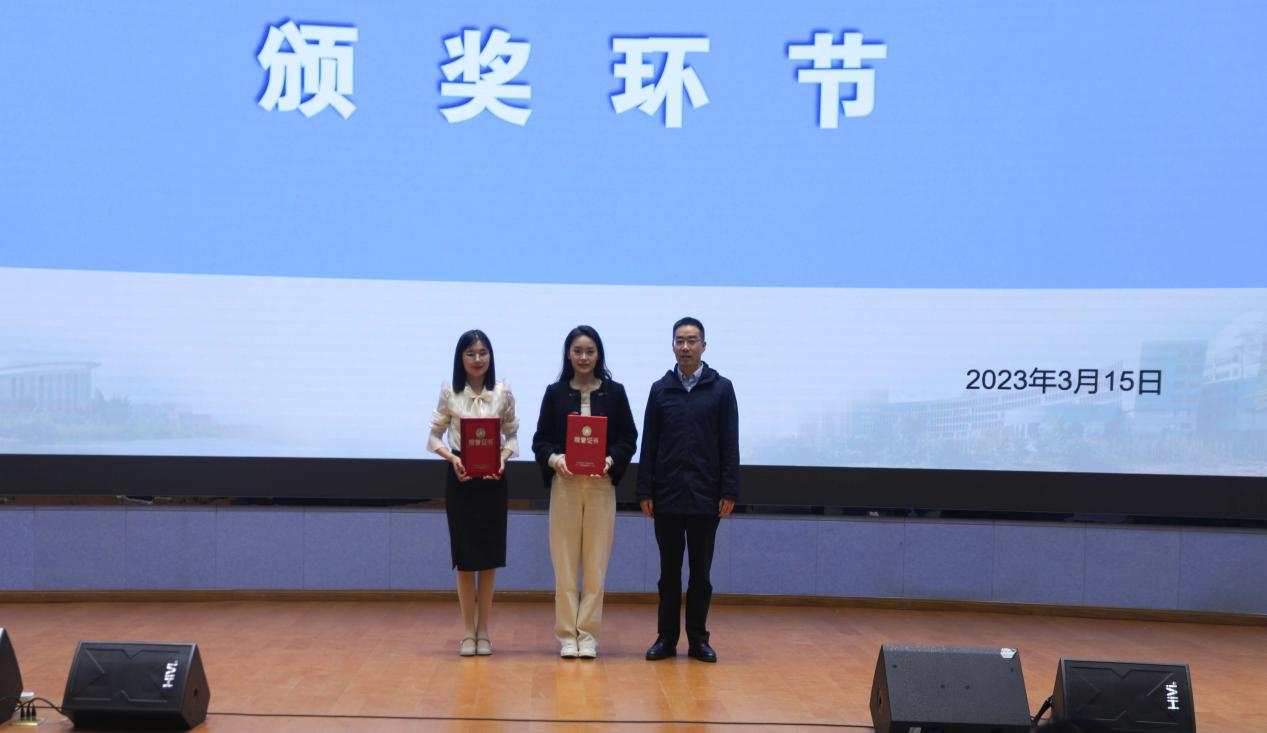 (重庆对外经贸学院校团委书记史丽涛与二等奖获得者)