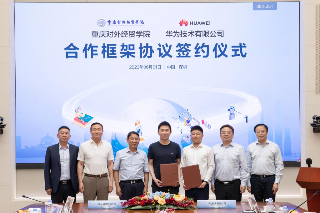 6月1日,重庆对外经贸学院与华为技术有限公司在深圳华为坂田基地签署合作框架协议。重庆对外经贸学院理事长郭元新,副理事长郭斌,校长李明海,副校长蒋满元,华为云全球生态部副总裁王希海,华为云重庆总经理王磊等领导出席协议签约仪式。
