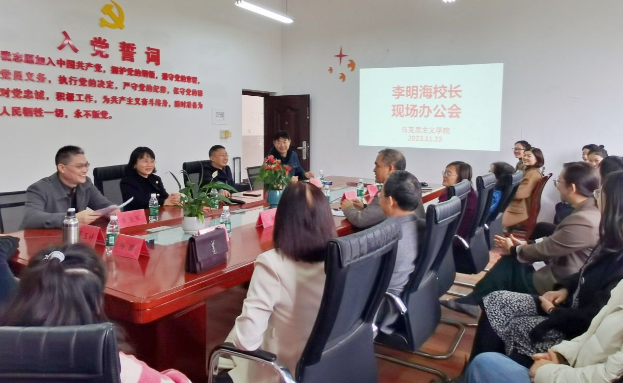 2023年11月23日,学校校长李明海教授到马克思主义学院调研,主持召开现场办公会,面对面研究推进马克思主义学院建设的相关事宜。驻校理事、人事处处长刘卫民,学院副院长李亚军、史丽涛以及马克思主义学院全体教师参会。