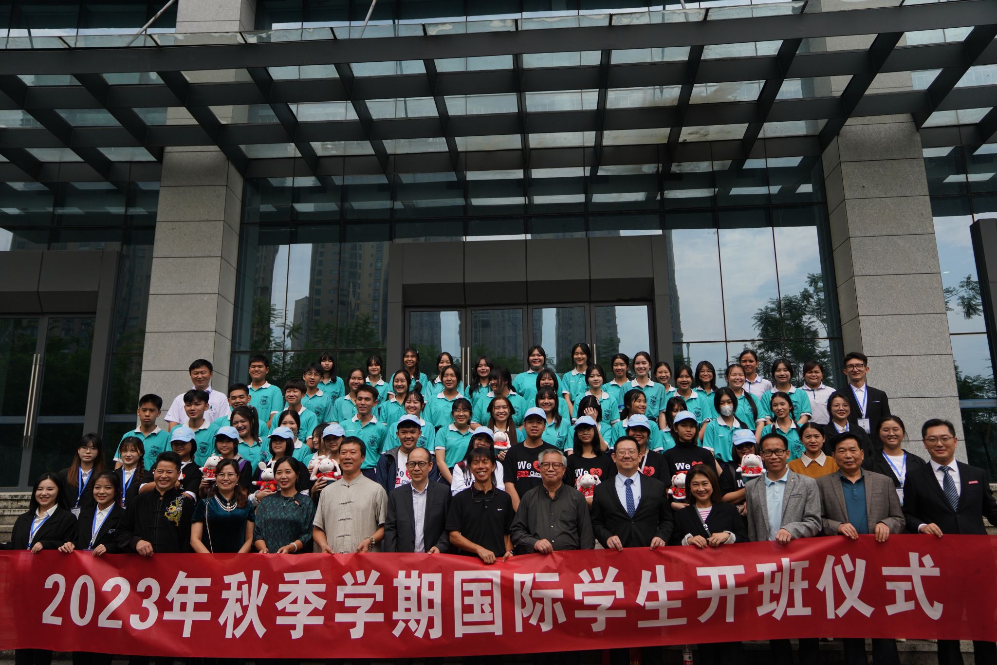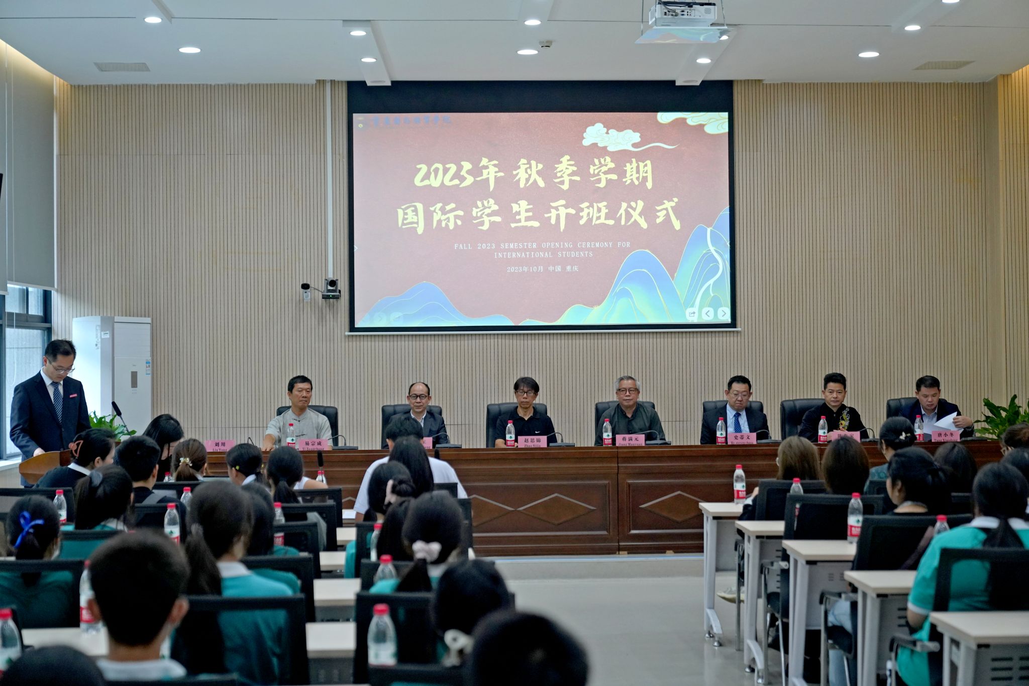 10月16日上午,学校2023年秋季学期国际学生开班仪式在9106顺利召开。重庆对外经贸学院副校长蒋满元,文学与创意传播学院院长段庸生,合川峡砚博物馆创办人、重庆市非物质文化遗产合川峡砚代表性传承人易宗成,合川天龙武馆创办人、峨眉派和少林派传人陈作家,泰国玛丽薇学校校董Steven及夫人,泰国孔敬汉语教学中心校长赵思锦,泰国盛唐文化教育集团董事长唐小冬、总经理马军山以及来自泰国的54名师生参加了开班仪式。活动由国际交流合作处处长刘用主持。