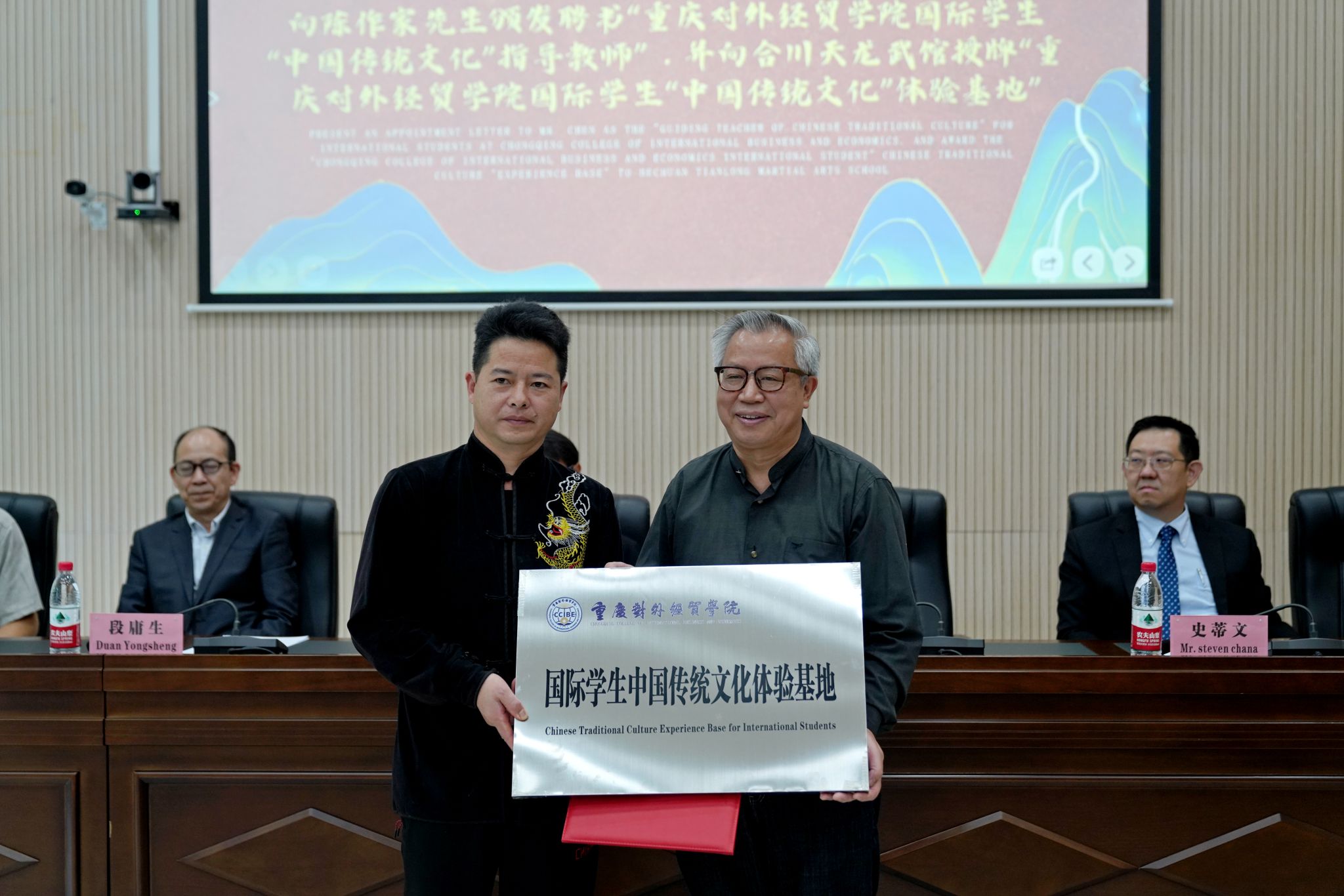 期间,蒋满元副校长向合川峡砚博物馆和合川天龙武馆授牌“重庆对外经贸学院国际学生”‘中国传统文化’体验基地”,旨在以非物质文化遗产为桥梁,向国际学生传播中国传统文化,讲好中国故事。此次游学之旅,同学们也将前往峡砚博物馆和天龙武馆实地感受中国峡砚文化和中华武术的独特魅力。