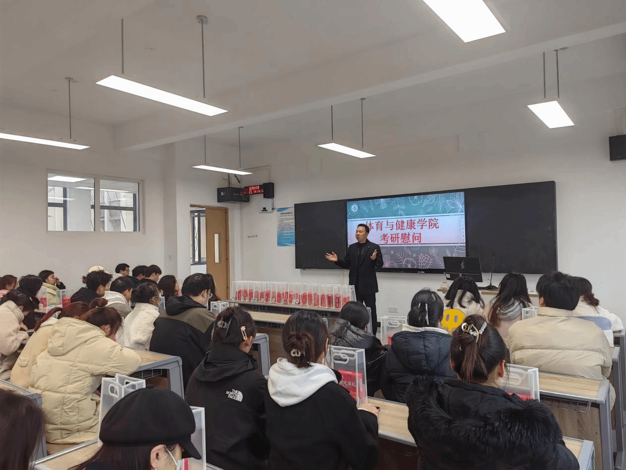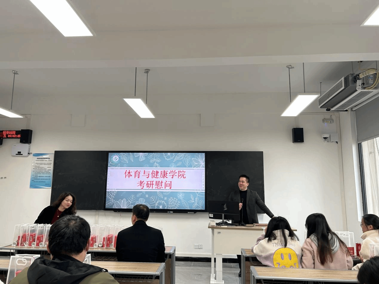 12月8日,体育与健康学院于B7204教室开展了考研送温暖慰问活动,党总支书记谢冬、副院长贾勇、毕业生辅导员与考研学子进行亲切交流和慰问。学院党总支书记谢冬代表学院向考研学子们表达了最真挚的祝福,对同学们的努力学习、追求梦想的精神给予了高度的赞扬与肯定。学院副院长贾勇亲切询问学子的复习进度、报考院校以及心理状态等相关情况,鼓励同学们合理规划时间和进度,做到劳逸结合,保持平稳的心态,以饱满的精神状态迎接最后的考试。活动最后,学院领导和毕业生辅导员为同学们发放了精心准备的“考研加油包”,祝愿考研学子能够一战成硕、金榜题名。