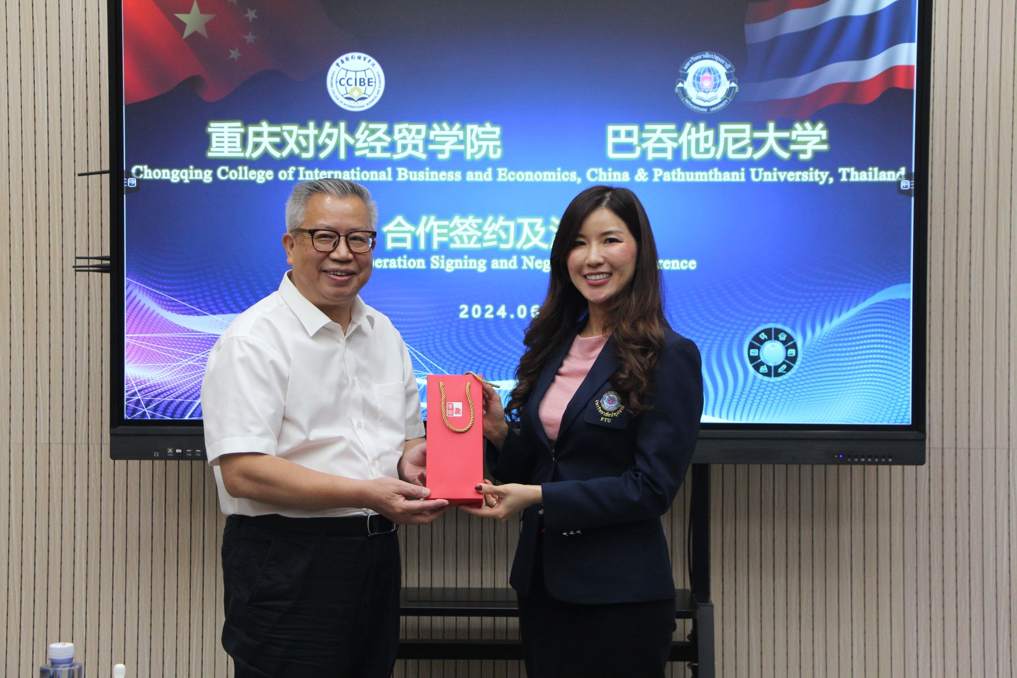 李明海校长向来宾介绍了学校近年来的办学情况和对泰交流合作所取得的成绩,感谢巴吞他尼大学在重庆对外经贸学院教师发展、学生培养等方面给予的大力支持。
