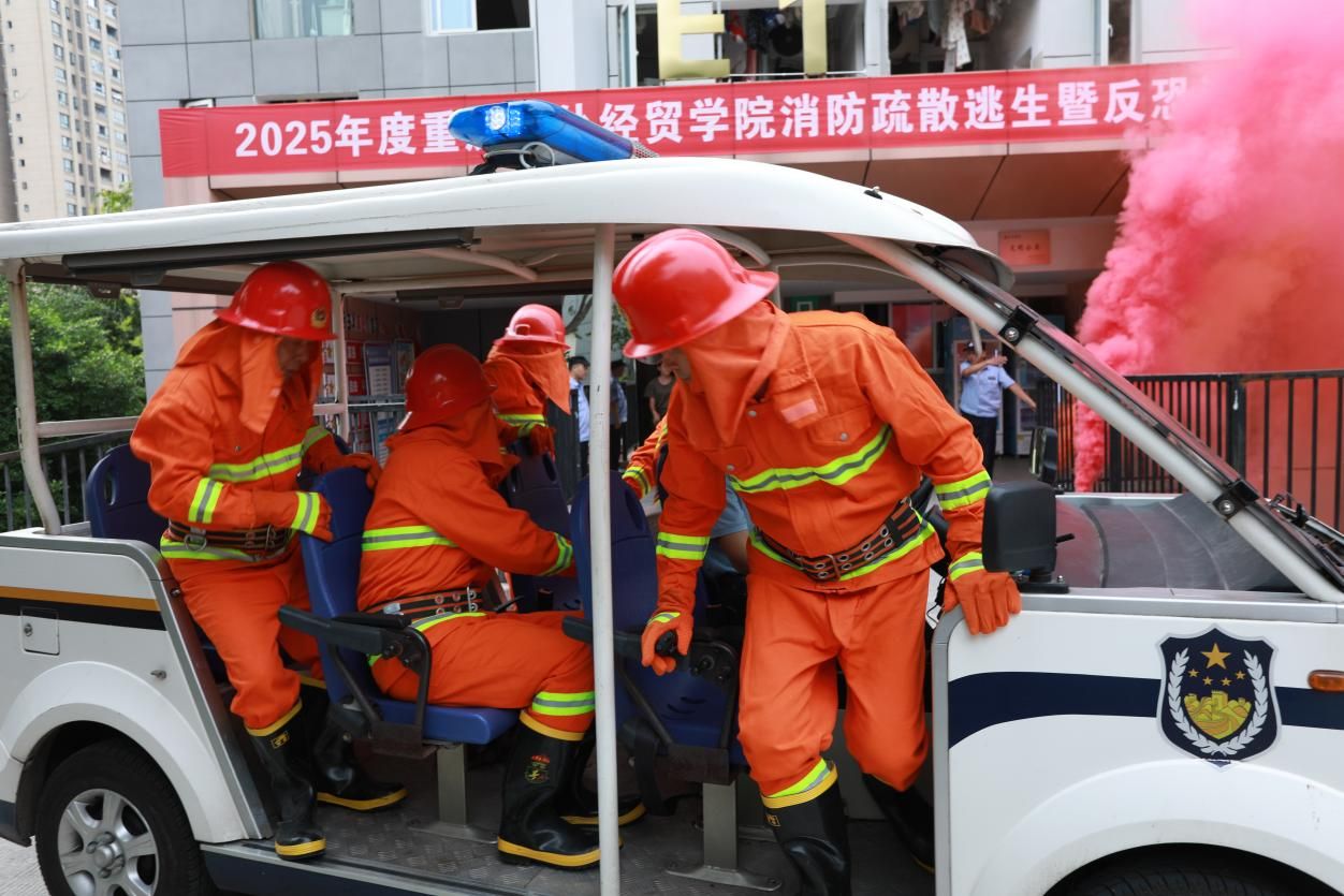 指令下达后,模拟烟雾弥漫,警铃响起。公寓值班人员迅速响应并上报火情。与A校区不同的是,B校区特邀合川区消防救援支队的消防员参与,增强了演练的真实性和专业性。