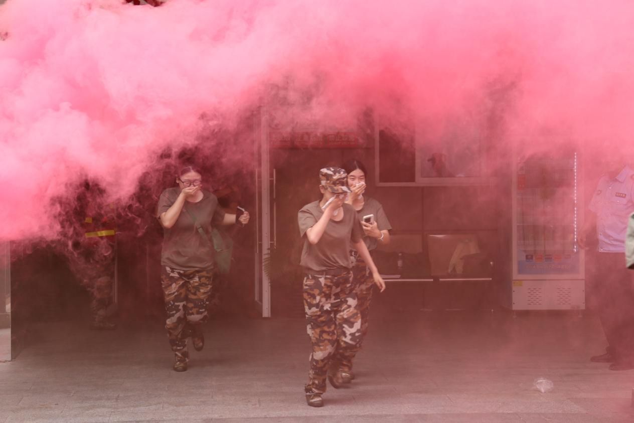 B校区消防疏散演练现场,学生用湿毛巾捂住口鼻迅速向安全区域疏散