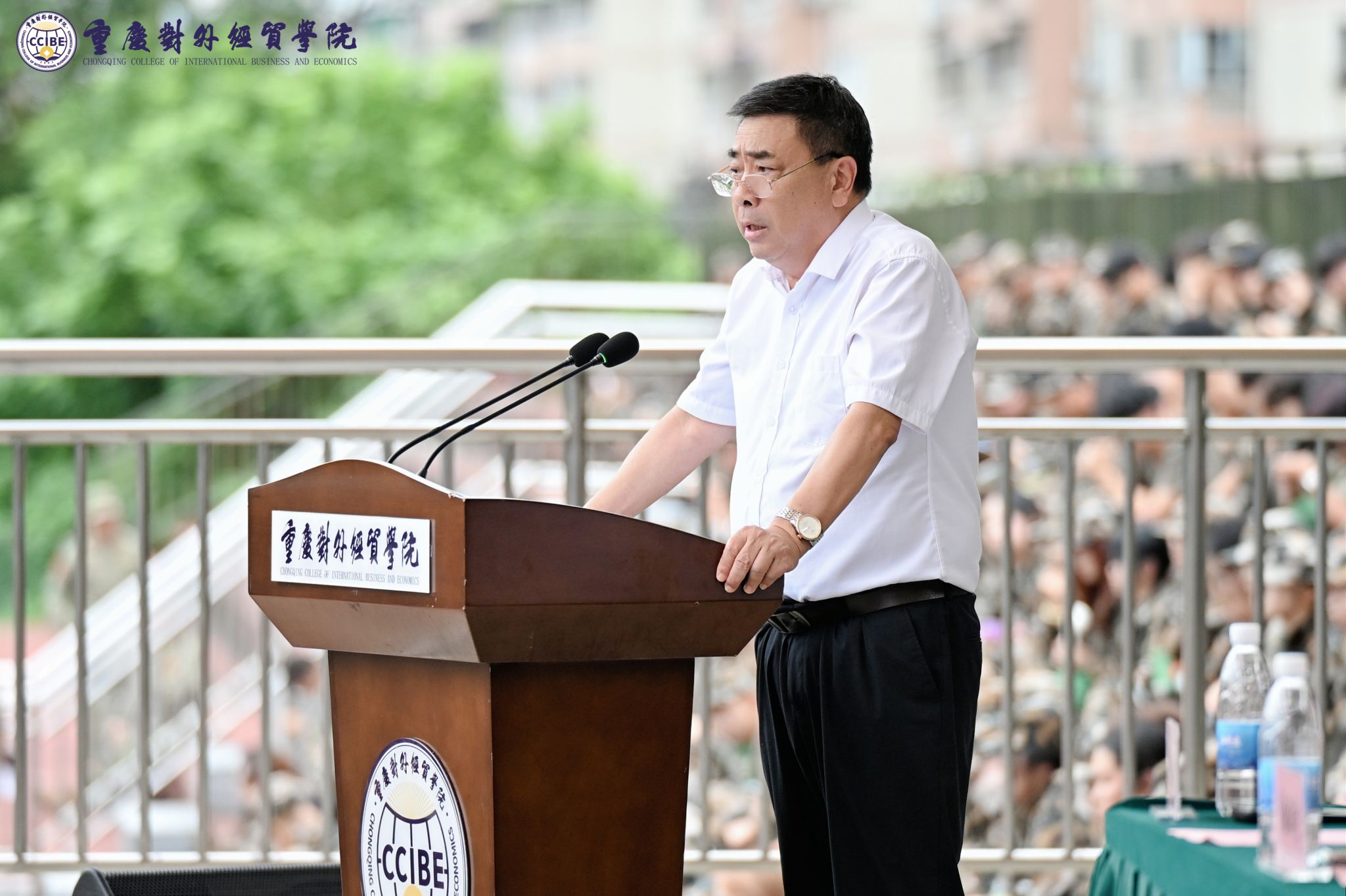 最后,党委书记、督导专员何大海同志发表讲话。他对 2025 级学生军训成果展示活动的圆满举行表示祝贺,对全体军训学员在军训中的出色表现给予高度评价,对军训教官、指导员及相关工作人员的辛勤付出表示衷心感谢。何书记在讲话中对大家提出了三点期望:一是要把“纪律意识”内化于心、外化于行;二是要把“协作精神”融入集体、化为常态;三是要把“拼搏韧劲”刻入骨髓、永不言弃。他希望全体新生能将此转化为未来求学路上的不竭动力,把坚韧品格融入学习实践,既要志存高远,也要脚踏实地,努力成长为堪当民族复兴大任的时代新人,让青春在奋斗中绽放绚丽光彩。