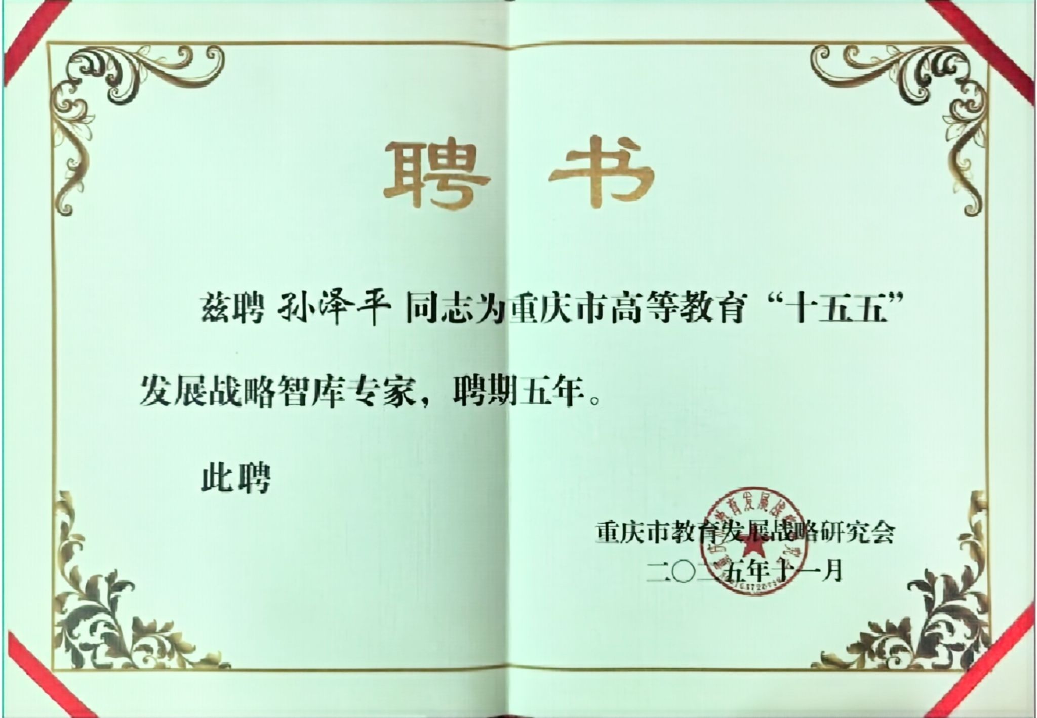 会上,主办方介绍了“重庆市高等教育战略规划智库”建设情况,公布首批智库专家名单并举行聘任仪式。孙泽平教授长期深耕高等教育管理与发展研究领域,具备丰富的高校办学实践经验和深厚的学术研究积淀,其受聘成为市级高等教育战略规划智库专家,既是市级层面对孙泽平教授专业能力与行业贡献的高度认可,也是对我校在高等教育领域办学成效与研究实力的充分肯定。