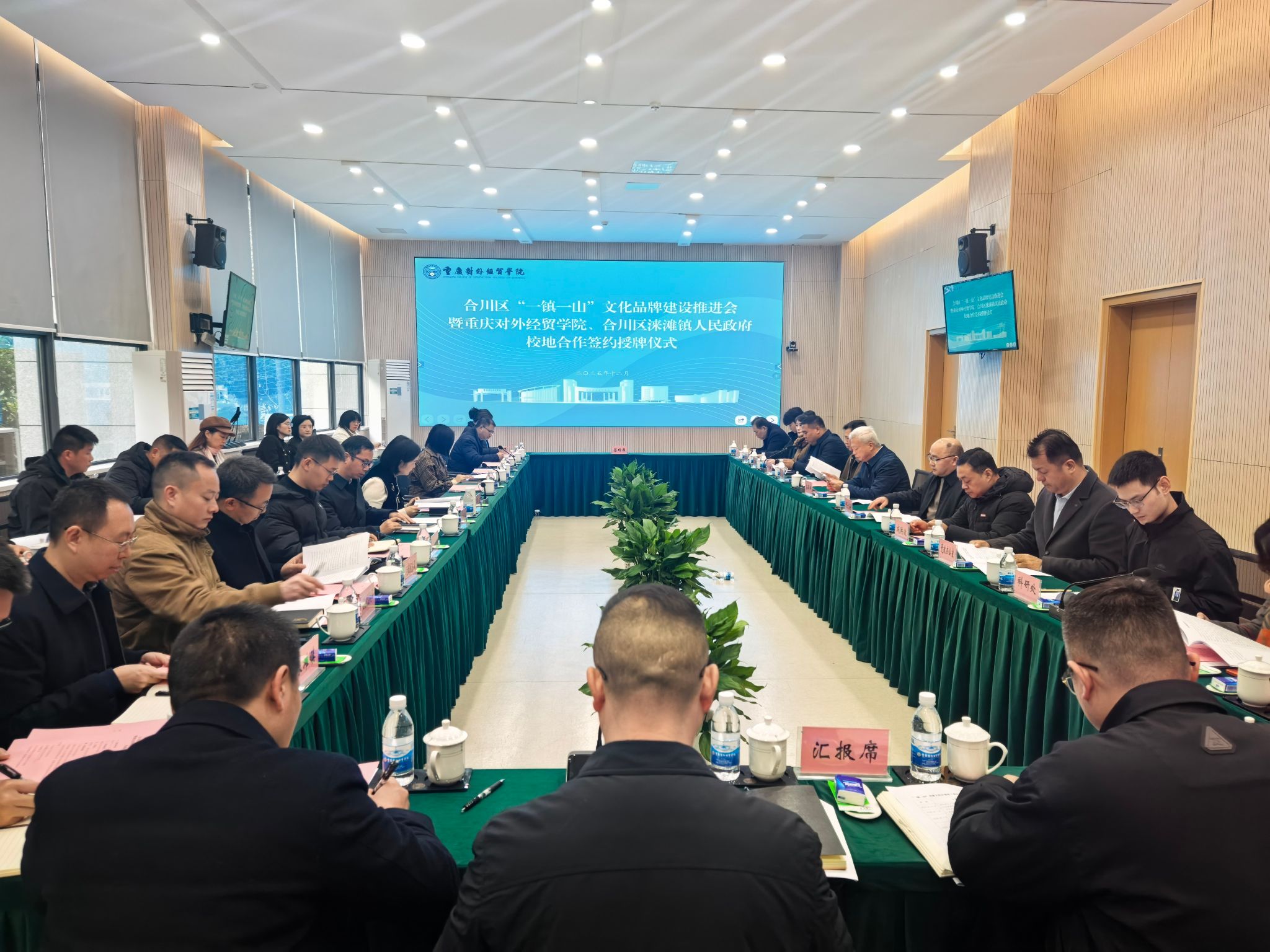 12月18日,合川区“一镇一山”文化品牌建设推进会暨重庆对外经贸学院与合川区涞滩镇人民政府校地合作签约授牌仪式在学校9106会议室成功举行。合川区委常委、统战部部长邓立,区政府副区长袁晓钦参加并发表讲话,校长孙泽平,党委书记、督导专员何大海,副校长李川出席仪式。