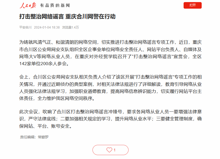 【人民日报】报道打击整治网络谣言 重庆合川网警在行动