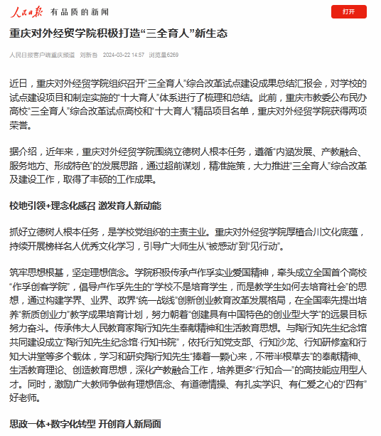 【人民日报】报道重庆对外经贸学院积极打造“三全育人”新生态