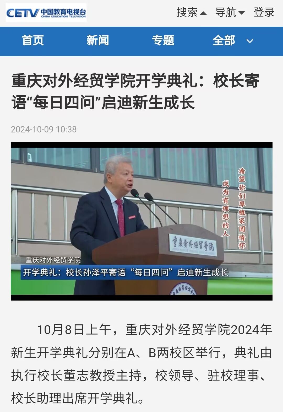 重庆对外经贸学院开学典礼:校长寄语“每日四问”启迪新生成长
