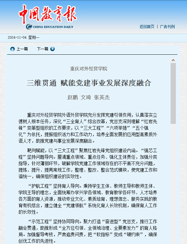 《中国教育报》报道重庆对外经贸学院三维贯通 赋能党建事业发展深度融合