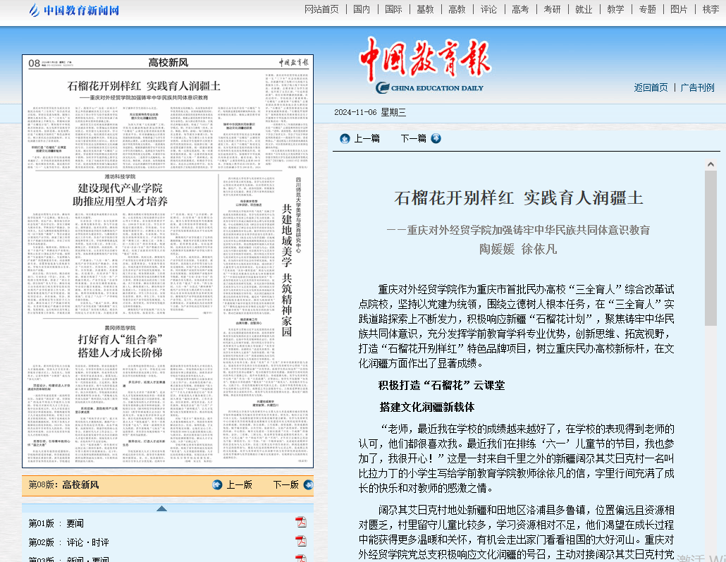 《中国教育报》报道石榴花开别样红 实践育人润疆土——重庆对外经贸学院加强铸牢中华民族共同体意识教育
