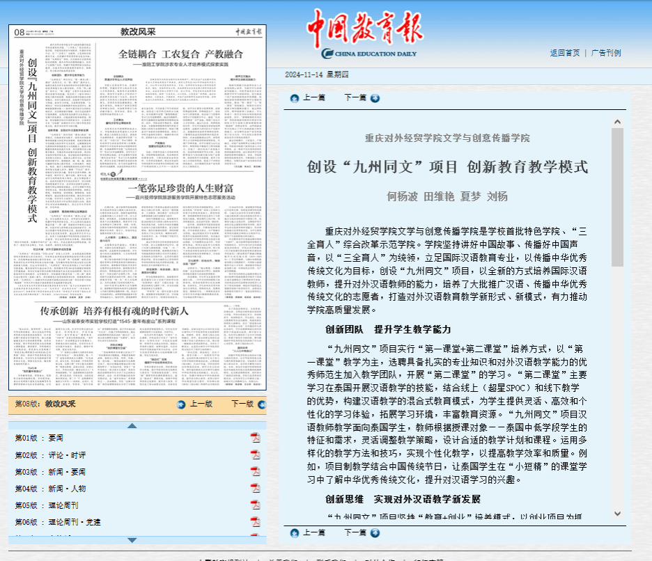 《中国教育报》报道创设“九州同文”项目 创新教育教学模式