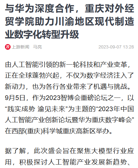 【上游新闻】报道与华为深度合作,重庆对外经贸学院助力川渝地区现代制造业数字化转型升级