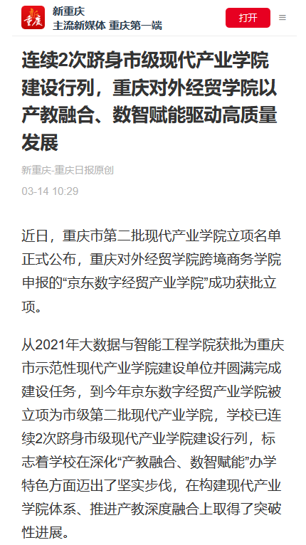 《重庆日报》报道连续2次跻身市级现代产业学院建设行列,重庆对外经贸学院以产教融合、数智赋能驱动高质量发展