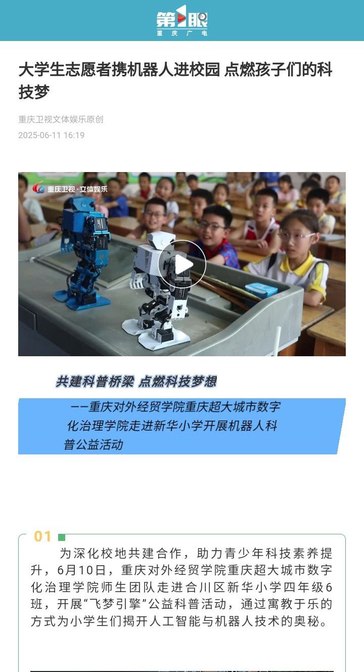 重庆广电第一眼新闻报道重庆对外经贸学院大学生志愿者携机器人进校园 点燃孩子们的科技梦