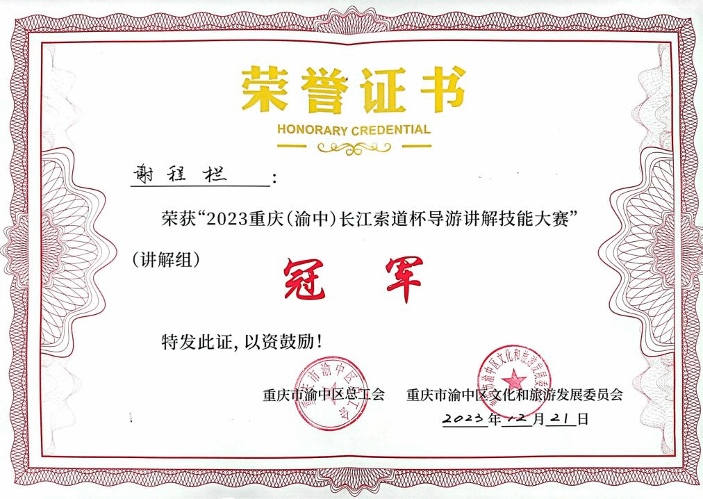 经过一周紧张严密的准备,在79名专业讲解员和各校优秀学生的复赛角逐中,谢程栏、陈玉铃和陈婕三名学生以声色并茂的讲解获得评委老师青睐,冲进赛事前十,获得参加决赛的资格。12月21日,在重庆长城酒店举行的2023重庆(渝中)“长江索道杯”导游讲解技能大赛决赛中,经过激烈刺激的比拼,学校谢程栏同学荣获大赛第一名,陈玉铃同学荣获“最佳风采奖”,陈婕同学荣获大赛“优秀奖”,重庆对外经贸学院荣获“最佳组织奖”。