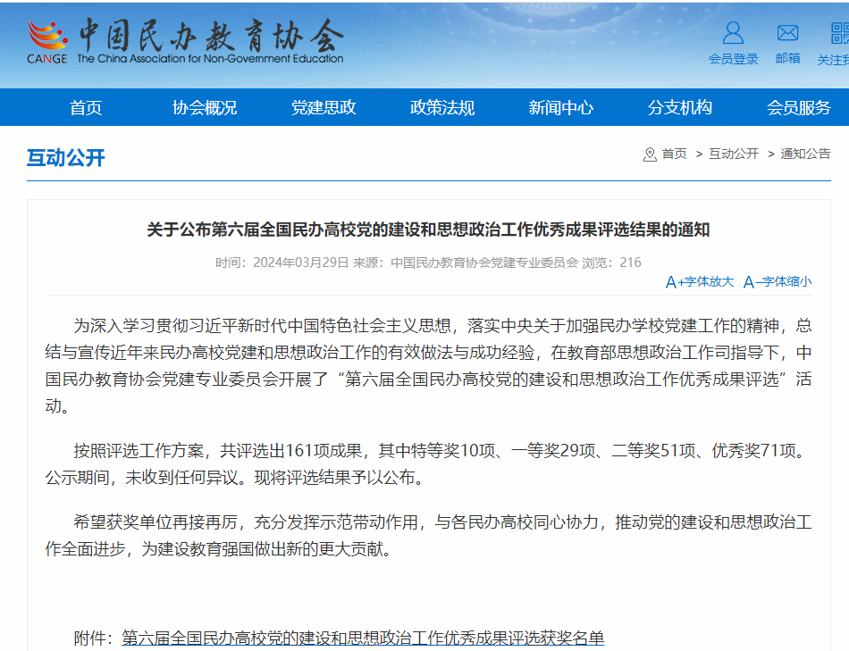 为深入学习贯彻习近平新时代中国特色社会主义思想,落实中央关于加强民办学校党建工作的精神,总结与宣传近年来民办高校党建和思想政治工作的有效做法与成功经验,在教育部思想政治工作司指导下,由中国民办教育协会党建专业委员会组织开展了“第六届全国民办高校党的建设和思想政治工作优秀成果评选”活动。经专家评审和公示,学校党委组织部申报的《构建“1551”组织建设模式,着力提升基层组织力----重庆对外经贸学院强化基层党组织功能发挥实践探索》荣获二等奖。