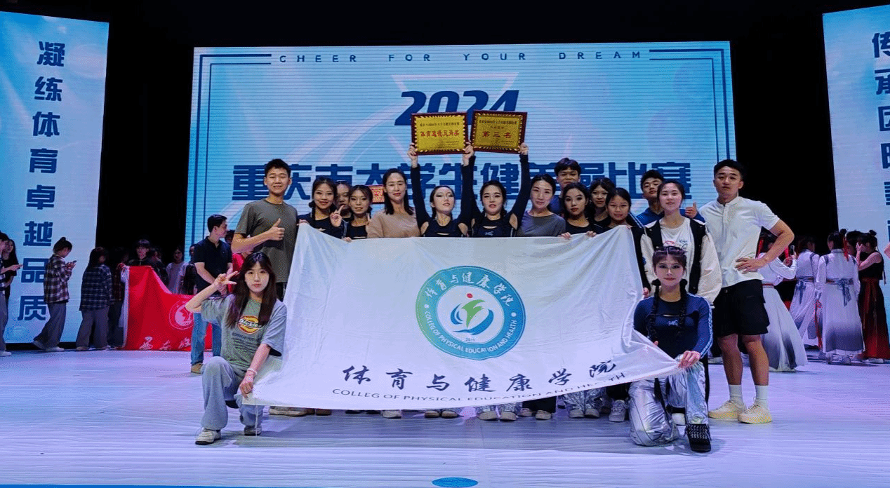 由重庆市教育委员会主办,四川外国语大学承办的2024年重庆大学生健美操比赛于5月8-10日在四川外国语大学大礼堂举行。学校派出了由校体委办公室主任、体育与健康学院副院长贾勇为领队,体育与健康学院教师谭娟、向路、邓茗丹为教练,20名学生组成的重庆对外经贸学院代表队参赛。本次比赛分为甲、乙、丙三个组别,丙组为体育专业(高水平运动队学生、体育特长生、运动系学生等)。