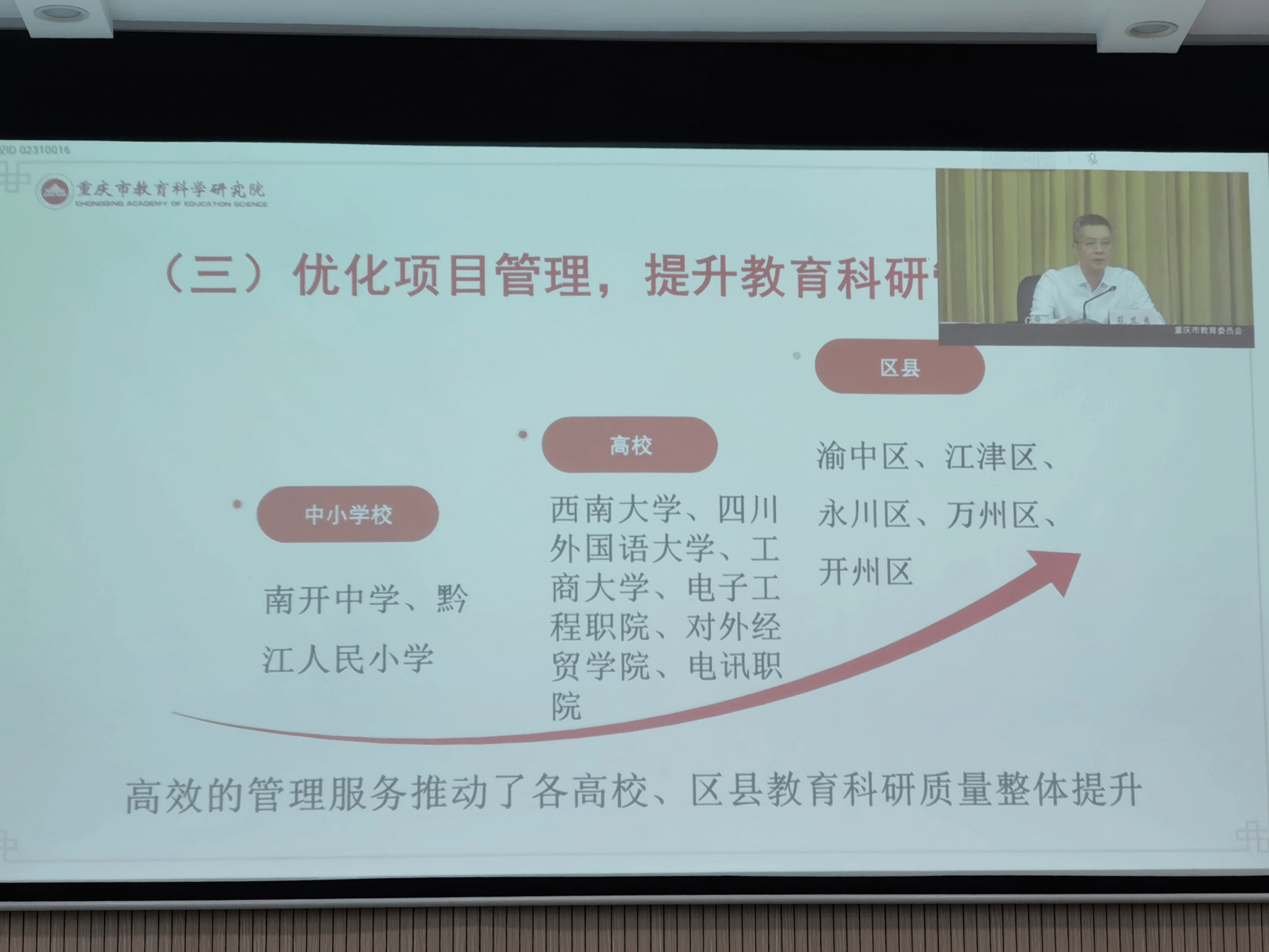 会议上,市教委、市教科院领导多次提及学校举办“全市国家级课题申报经验交流及民办高校教育科研工作研讨会”,立项“全国教育科学规划课题”,入选“重庆市教育科研实验基地”,对学校教育科研工作成效给予充分肯定。特别是学校作为民办高校获得全国教育科学规划课题国家课题立项,实现了重庆民办高校教育科研工作新突破。