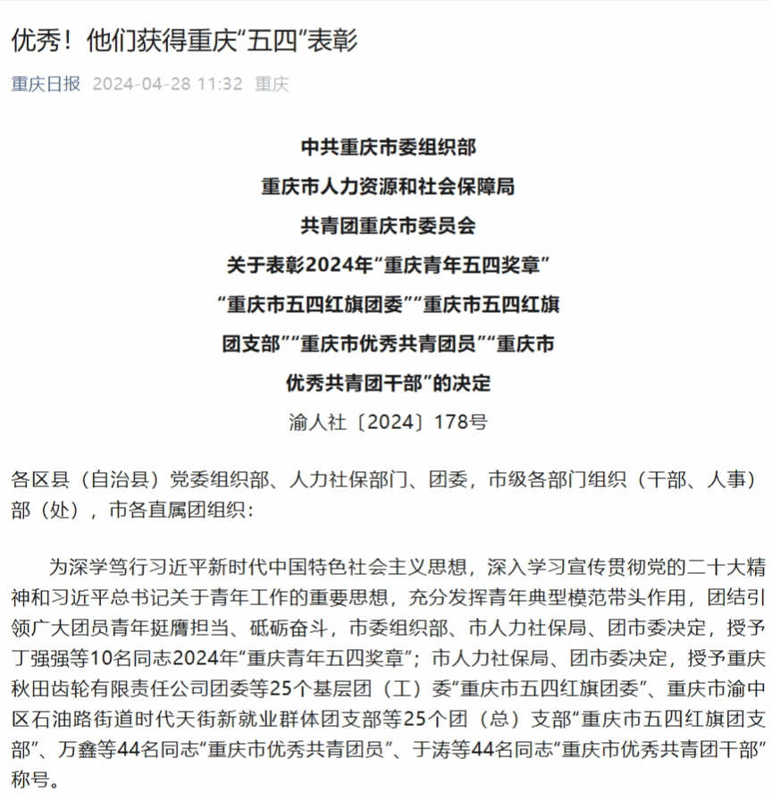 4月27日,由中共重庆市委组织部、重庆市人力资源和社会保障局、共青团重庆市委员会发布的关于表彰2024年“重庆青年五四奖章”“重庆市五四红旗团委”“重庆市五四红旗团支部”“重庆市优秀共青团员”“重庆市优秀共青团干部”的决定中,学校团委副书记冯斯迪老师荣获“重庆市优秀共青团干部”称号。
