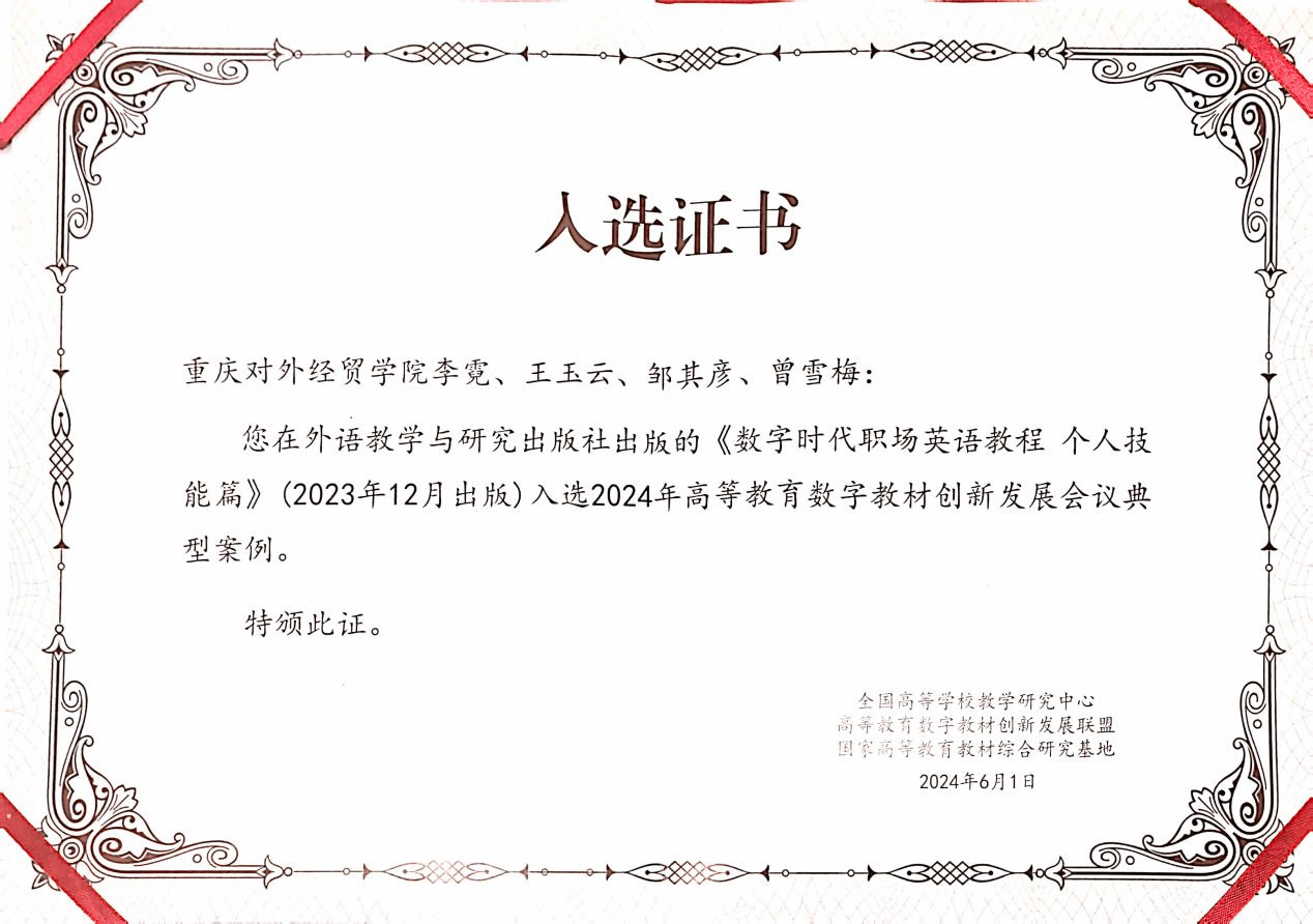 在学校教务处统筹下,外语外贸学院李霓教授和王玉云教授担任总主编,邹其彦副教授和曾雪梅副教授担任分册主编的《数字时代职场英语教程 个人技能篇》荣获首批“高等教育数字教材创新发展会议2024年数字教材典型案例”。