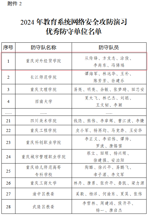 近日,重庆市教育委员会下发《关于2024年教育系统网络安全攻防演习结果的通报》(渝教科函〔2024〕14号),学校以优异表现获评“优秀防守单位”。