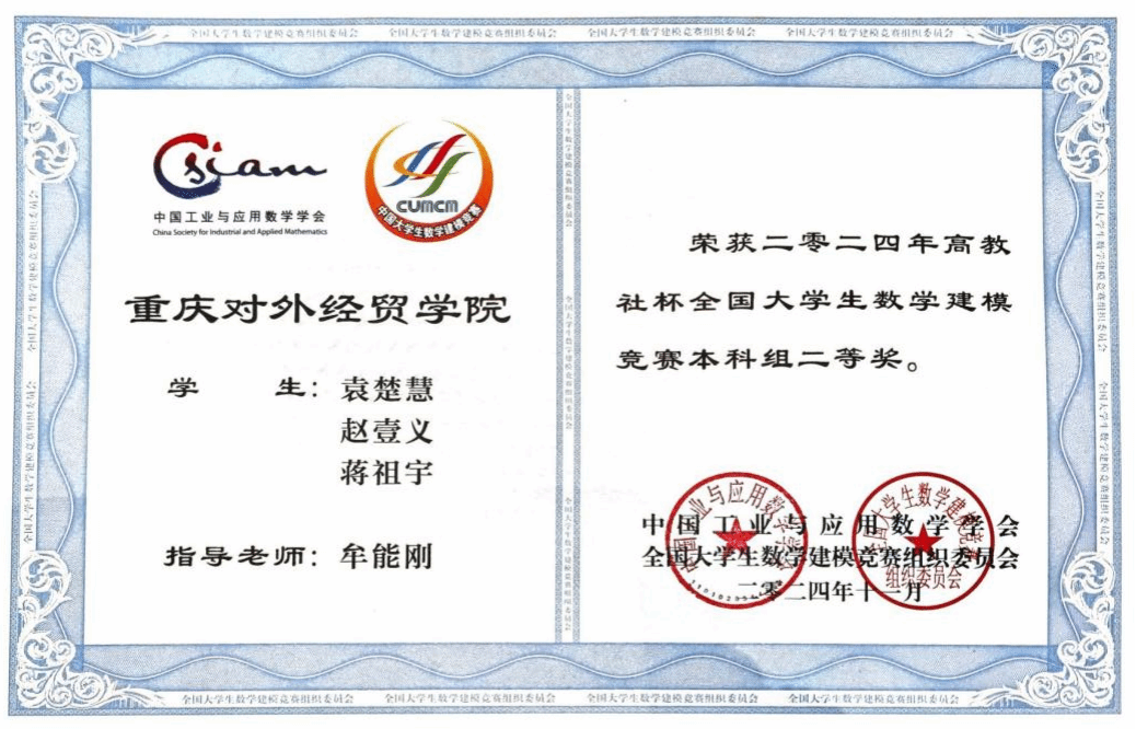 在全国大学生数学建模竞赛这一全国高校规模最大、影响力最强的基础性学科竞赛平台上,我校学子凭借出色的表现,荣获了全国二等奖1项,重庆市一等奖2项,重庆市二等奖3项。