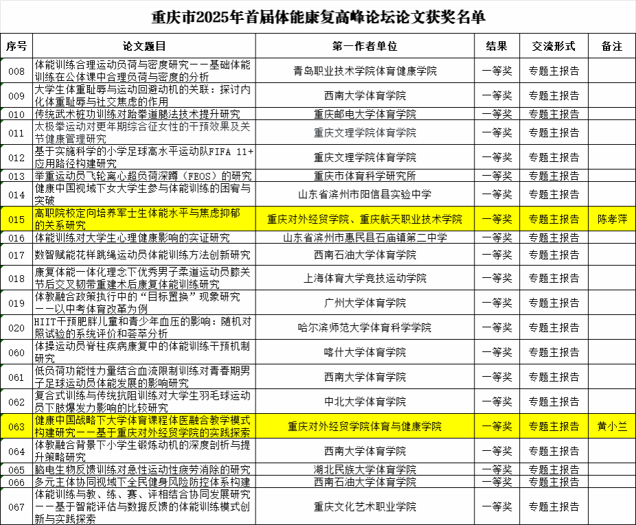 近期由重庆市体科所主办,重庆文理学院承办的“重庆市首届体能康复高峰论坛”征文比赛中,我校体育与健康学院陈孝萍、黄小兰两位老师在680名作者中脱颖而出,获得一等奖。