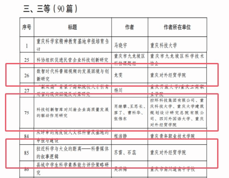 近日,重庆市科学技术协会、四川省科学技术协会联合公布了第九届科协改革研讨活动优秀论文评选结果,我校教师凭借扎实的学术研究与创新实践斩获多项荣誉,展现了学校在相关领域的科研实力。