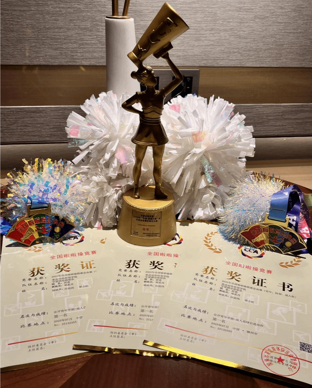 【本网讯】由国家体育总局体操中心主办,江西省赣州市承办的2025年全国啦啦操总决赛于2025年7月21-24日在江西省赣州市龙南体育馆举行。为了提高我校在全国高校中的影响力,更好地提高整个队伍的竞技水平,锻炼学生的舞台经验。在校体委的领导下,校体委决定将校啦啦操队伍中的双人花球推向全国,由体育与健康学院副院长贾勇为领队,体育与健康学院教师邓茗丹为教练,由重庆市大学生健美操比赛双人花球冠军代表学校参加本次比赛。本次比赛分为公开青年甲组(体育院系及艺术院系组)、公开青年乙组(普通院校)、公开青年丙组(高职高专)三个组别。
