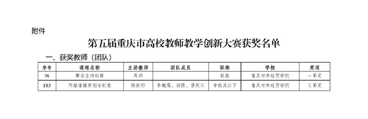 近日,重庆市教育委员会公布了第五届重庆市高校教师教学创新大赛获奖名单,我校教师在众多优秀选手中脱颖而出,斩获殊荣:
