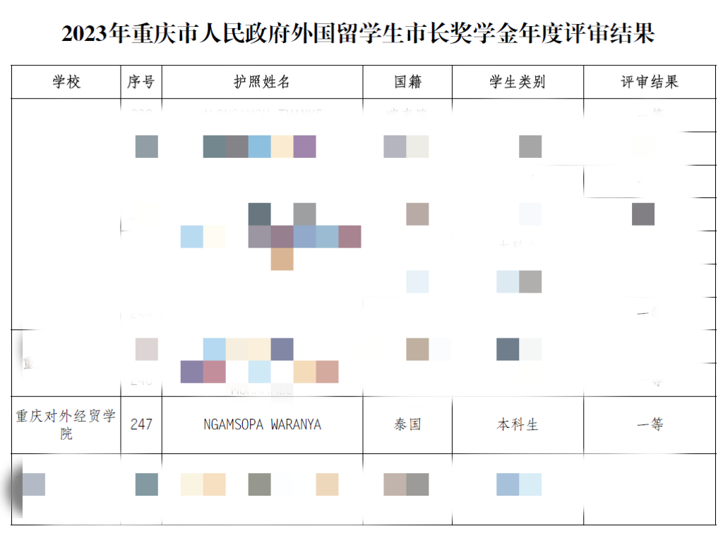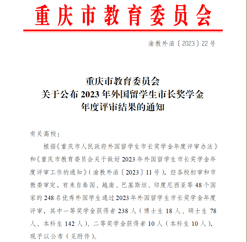 6月21日,重庆市教育委员会下发《关于公布2023年外国留学生市长奖学金年度评审结果的通知》(渝教外函【2023】22号),学校2023级国际经济与贸易专业留学生NGAMSOPA WARANYA(程漫)通过评审,再次获得本科一等奖学金。