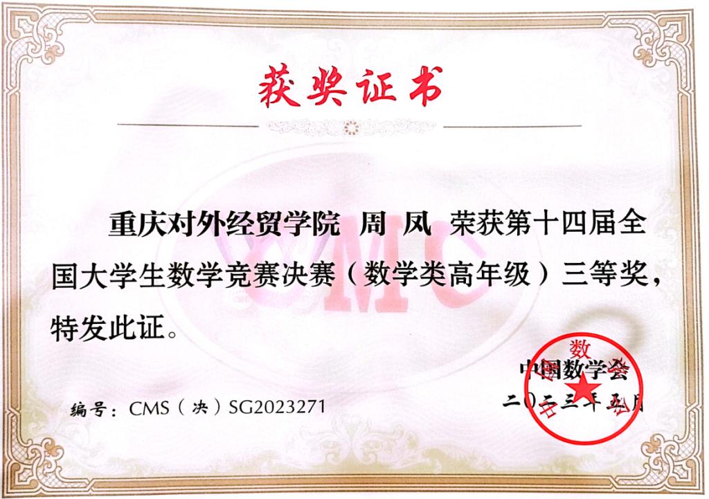 第十四届全国大学生数学竞赛于2023年5月26-28日在广东工业大学成功举行,本届参加赛区32个,高校1024所,初赛参赛人数高达23万,决赛参赛人数922人(数学类461人)。学校在重庆赛区初赛中荣获重庆市一等奖23人(非专业组2人)、二等奖27人(非专业组2人)、三等奖30人(非专业组4人),其中数学与计算机学院周凤同学、石梦欢同学成功入选数学类高年级组决赛,最终周凤同学取得全国三等奖的好成绩。