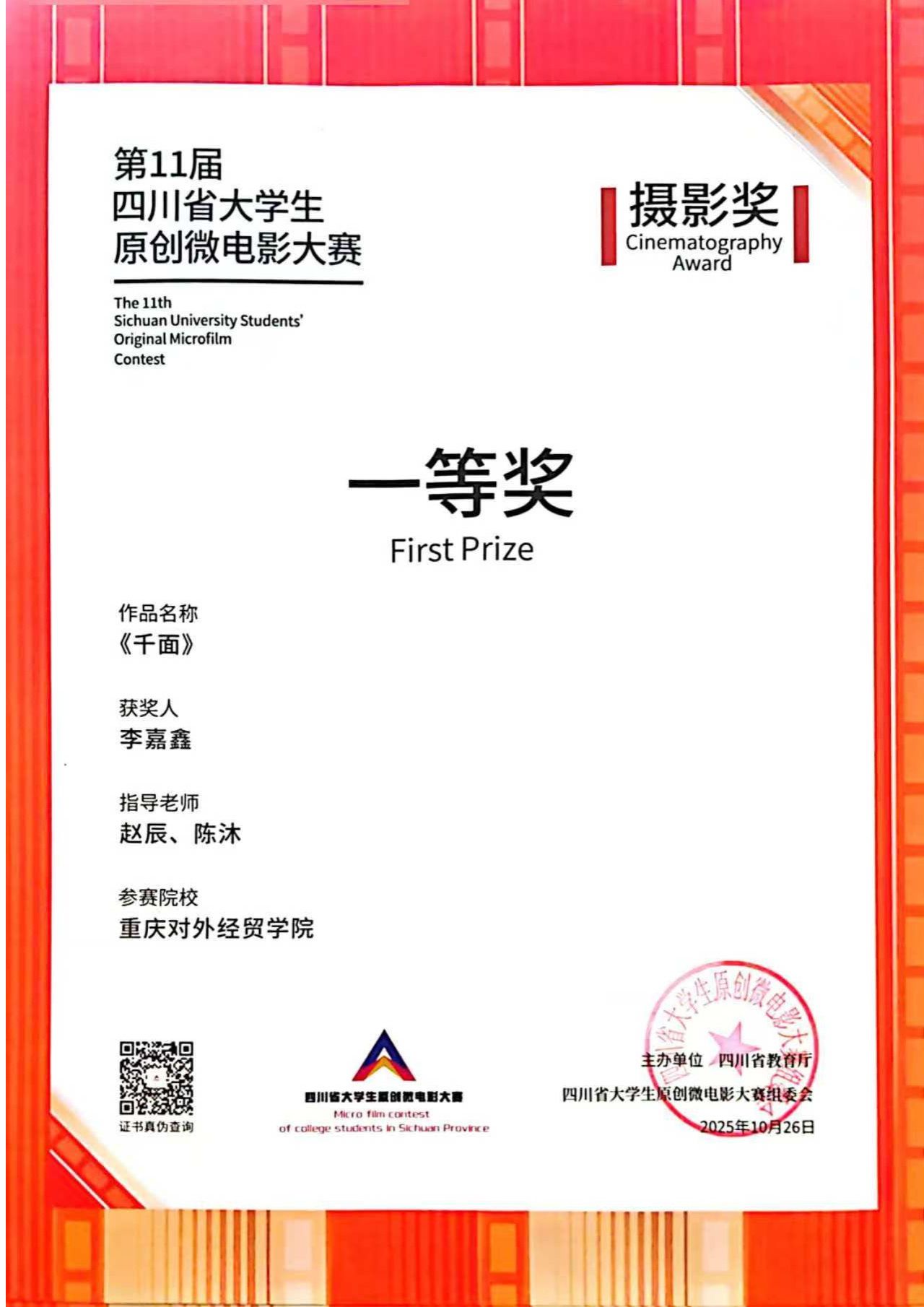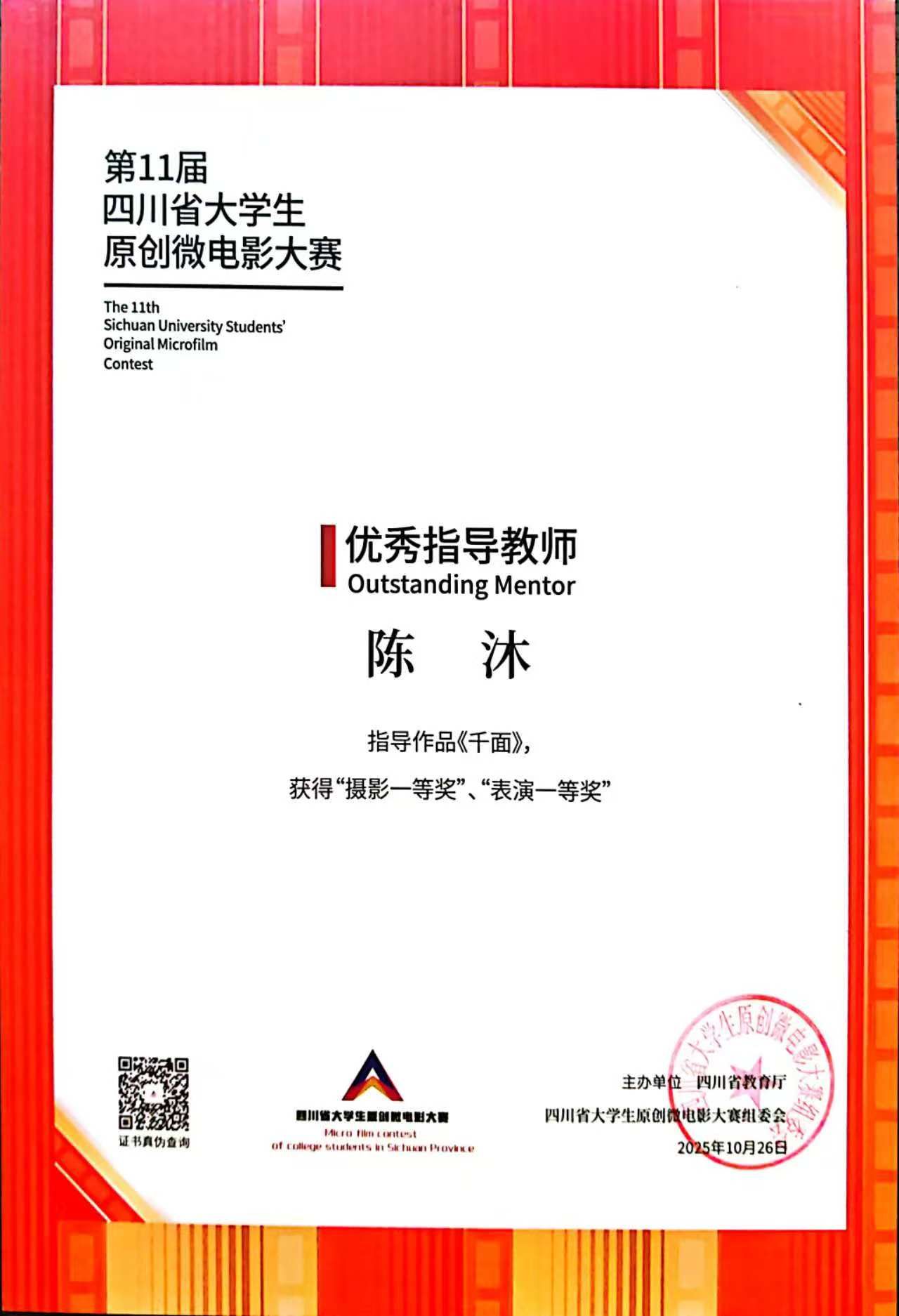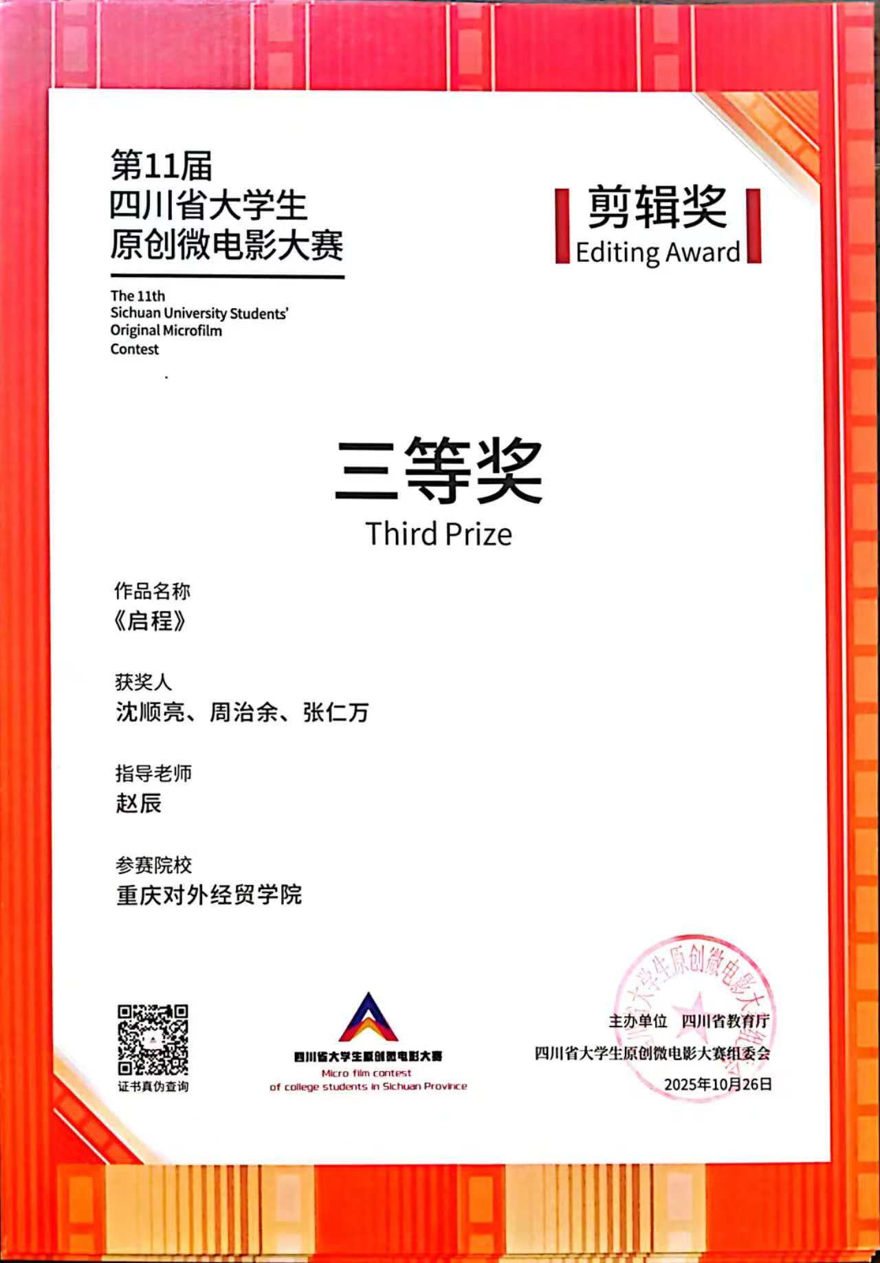 近日,由四川省教育厅主办的2025年(第十一届)四川省大学生原创微电影大赛获奖名单正式公布获奖名单。影视融媒体学院学子的作品从全国及海外67所高校的477部决赛作品中脱颖而出,一举斩获12项单项荣誉,涵盖剧情片、导演奖、摄影奖、剪辑奖、表演奖五大类别。学校荣获“优秀组织奖”,教师赵辰、陈沐获评“优秀指导教师”。