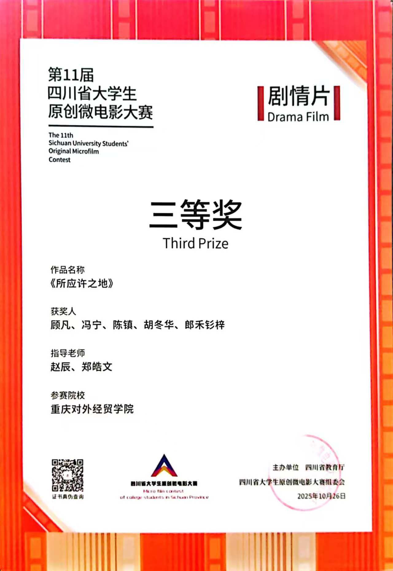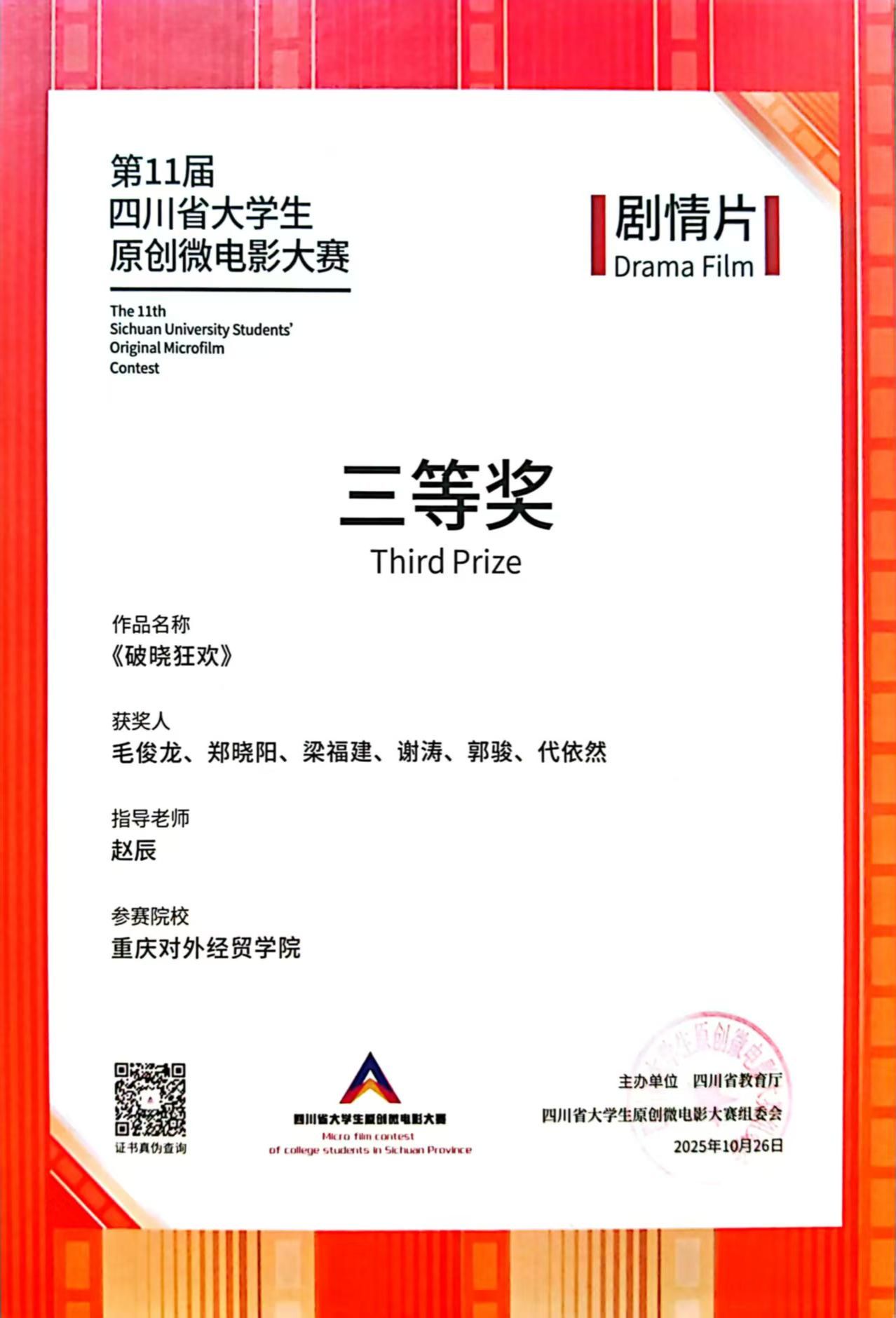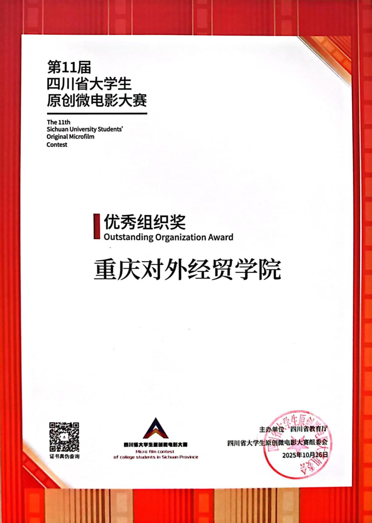 近日,由四川省教育厅主办的2025年(第十一届)四川省大学生原创微电影大赛获奖名单正式公布获奖名单。影视融媒体学院学子的作品从全国及海外67所高校的477部决赛作品中脱颖而出,一举斩获12项单项荣誉,涵盖剧情片、导演奖、摄影奖、剪辑奖、表演奖五大类别。学校荣获“优秀组织奖”,教师赵辰、陈沐获评“优秀指导教师”。