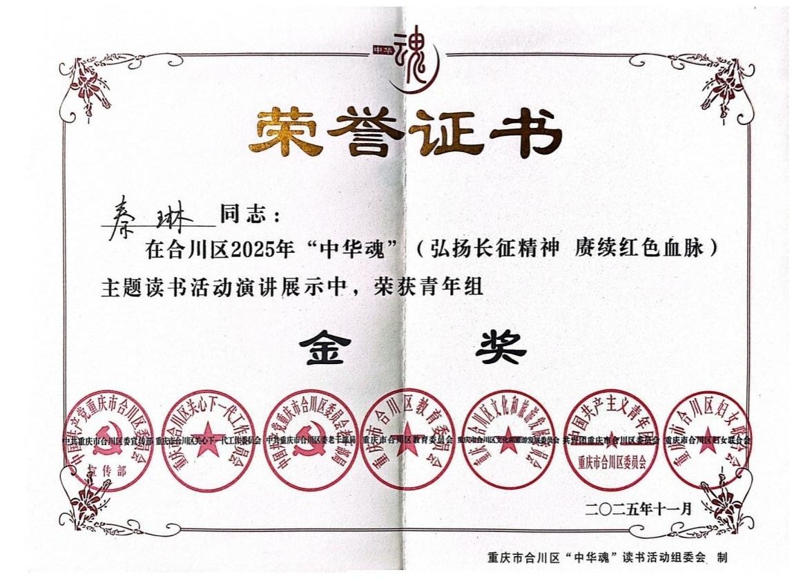 近日,在合川区“中华魂”(弘扬长征精神、赓续红色血脉)读书活动演讲比赛中,我校影视融媒体学院2025级播音与主持艺术专业的秦琳同学,在本次比赛中凭借优秀的专业能力与精湛的主题表达,脱颖而出,以高校组一等奖和青年组金奖的好成绩,一举获得代表合川区晋级市赛的入场券!