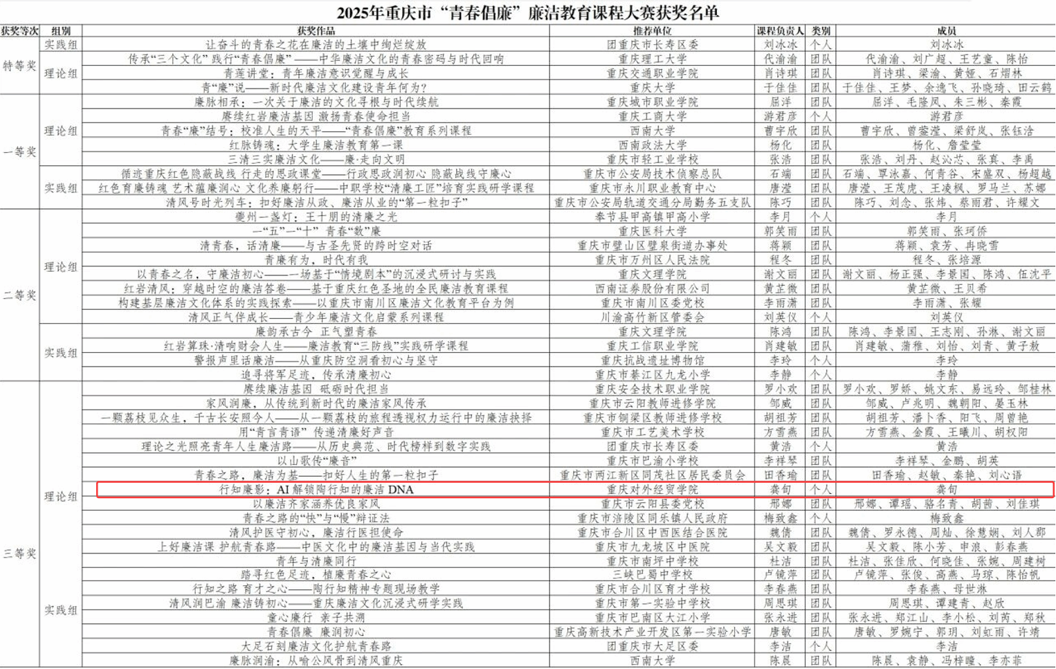 欣传捷报!我校外语外贸学院龚旬教师在2025年重庆市“青春倡廉”廉洁教育课程大赛中,凭借精湛的教学展示斩获理论教学类三等奖!