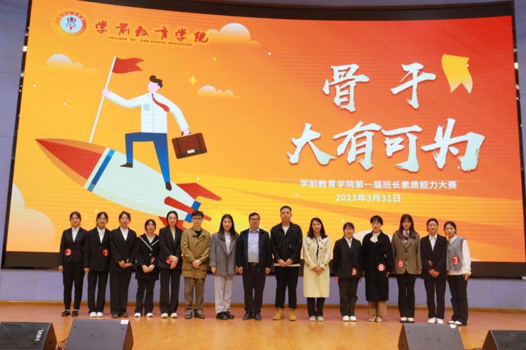 2023年3月31日,学前教育学院举办第一届“骨干大有可为”班长素质能力大赛,党政办秘书科科长曹军辉、学前教育学院团总支书记王小琴、视融媒体学院辅导员廖俊杰、学前教育学院辅导员王成昊、朱秋盈出席大赛。