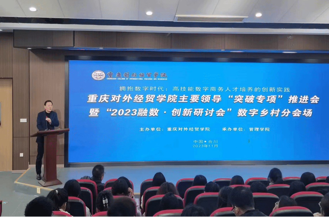 2023年11月23日,由管理学院承办的重庆对外经贸学院主要领导“突破专项”推进会暨“2023融数·创新研讨会”数字乡村分会在B8105和B2106顺利举行。此次会议邀请到了合川区文联主席李卫民、合川区国资委主任郭猛、隆兴镇党委书记代金川、合川诚信集团闫顺董事长、企业代表以及管理学院领导班子、魏鹏教授、各教研室主任等聚集在一起共同研讨数字乡村的发展路径。此次研讨会以圆桌会议和主题讲座方式分别进行。