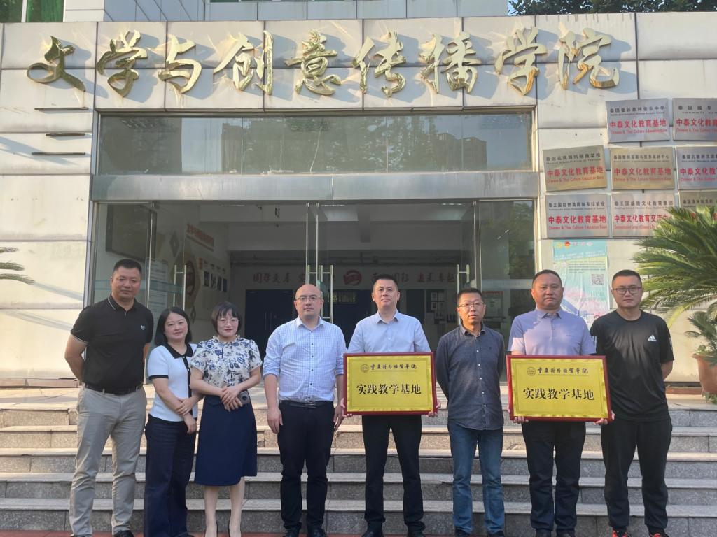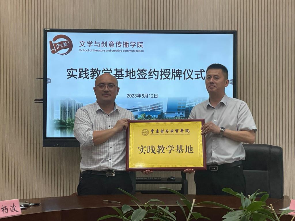 重庆对外经贸学院文学与创意传播学院于5月12日下午,在第九教学楼9104教室举行实践教学基地签约授牌暨客座教授聘任仪式。出席本次仪式的嘉宾有:涪陵第四中学校副校长卢晓清,涪陵第十九中学校副校长钟玉翔,奔行研学公司总经理余建军,重庆对外经贸学院教务处副处长彭高中,文学与创意传播学院党总支书记、代理院长何杨波,副院长陈寿琴,实践教学管理科科长郭峻辰,以及学院其他老师。本次授牌仪式由文学与创意传播学院代理院长何杨波主持。