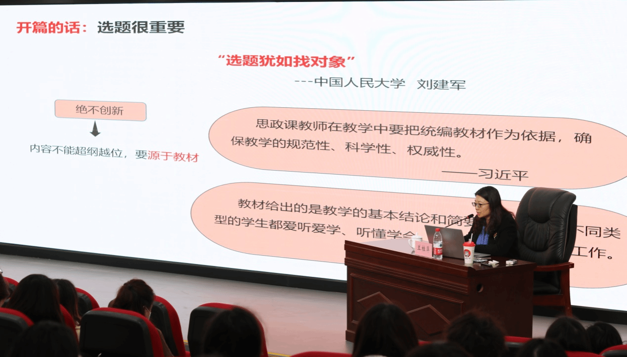 2023年12月7日下午,学校B校区8105宣讲室听众满堂,一场精彩纷呈的报告会正在举行。全国高校思政课教学标兵、第二届全国高校思政课教学展示特等奖获得者、全国高校思政课影响力提名人物,重庆师范大学马克思主义学院兰桂萍教授作“提升思政课教学设计与实施实效性的思考”专题报告。报告会由马克思主义学院史丽涛副院长主持,200余名师生参加。