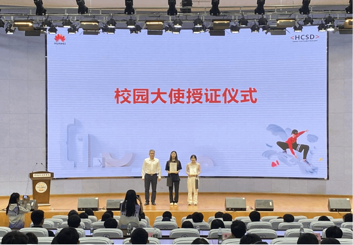 活动中期,华为云为大数据智能工程学院HCSD校园大使李宣、章馨予两位同学举行了授证仪式,鼓励他们积极发挥引领作用,推动华为云技术在校园内的普及和应用。此外,华为云还详细解读了开发者认证体系,让同学们了解到获得专业认证对于个人成长和就业的重要性。