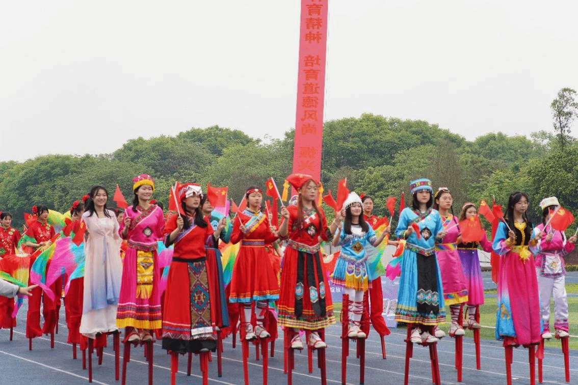 此次运动会开幕式不仅有踩高跷非遗文化活动的表演,在服装元素上还融合了学校现有30余个民族的传统服饰,展现出高校对非遗文化遗产传承的重视以及“民族团结一家亲”的画面。