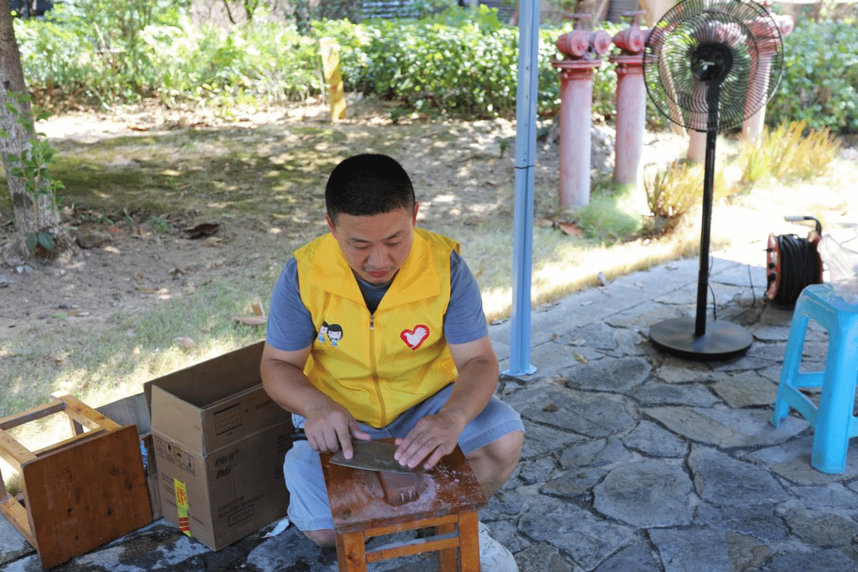 本次公益惠师活动为全校教职工及家属提供了免费磨菜刀服务、清洗地垫服务、熨烫衣服服务、小家电维修服务,活动现场吸引了大量教职工和家属前来体验参与,其中最受欢迎的项目就是“磨菜刀”服务,赢得教职工一致好评。