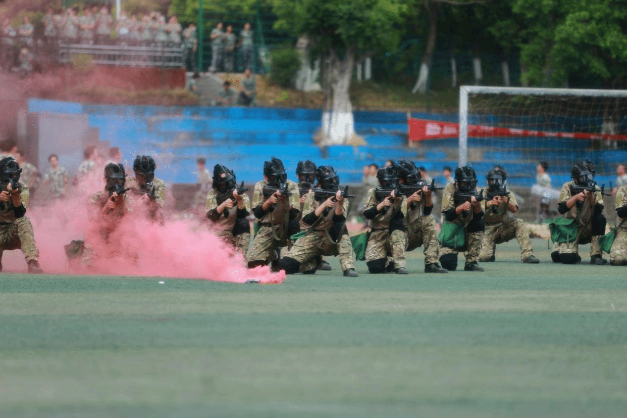升国旗,奏国歌。在雄壮的军歌声中,同学们步伐整齐划一,口号坚定响亮,随着教官一声令下,军训大比武正式开始,各连队同学身着迷彩,迈着刚劲有力的步伐前行。