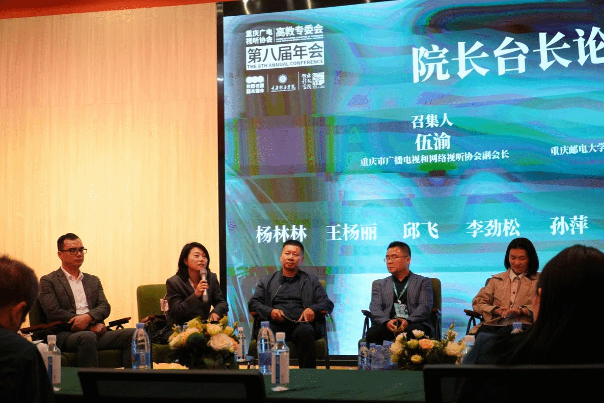 下午进行的是院长台长论坛。学院常务副院长王杨丽与来自綦江区、渝北区、巴南区融媒体中心主任以及长江师范学院、重庆文理学院等传媒艺术类二级学院院长进行现场交流对话,共同探讨数智时代视听产业变革与人才的培养经验。