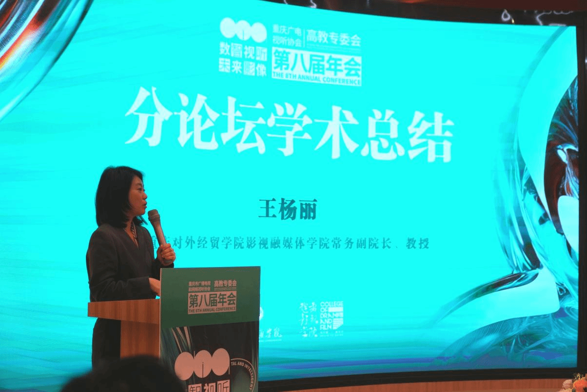 大会还开展多场平行论坛。常务副院长王杨丽教授作为点评人参加了“教材与教学论坛”,学院教师周洋、陈依彤、谢霞、冷天泽围绕有声读物的数字化变革、网络与新媒体专业毕业设计改革、应用型高校网络视听人才培养、地方高校播音人才培养模式创新等话题做现场汇报。副院长张琦教授作为主持人参与“圆桌论坛”,学院教师陈沐、龙雯、陈思弈就AI微短剧的数智化传播、主旋律影视作品赋能铸牢中华民族共同体意识机理研究、《黑神话:悟空》的游戏语境对文化认同感的影响等进行现场交流。闭幕式上,常务副院长王杨丽教授还应邀对“教材与教学论坛”进行学术总结。