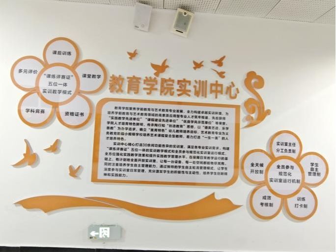 教育学院始终坚持“岗课训赛证展”六位一体的实训教学模式和“全员参与规范化”的实训室运行机制,持续健全管理制度。努力实现学生知识、关键能力与综合素质全面提升,达到“能唱会跳,能画会教”的基本职业素养。目前,学院共建成并投入使用17间专业实训室,与名优幼儿园、小学共建实践教学基地43个,为学生实训课程及校内外专业实践提供了保障。
